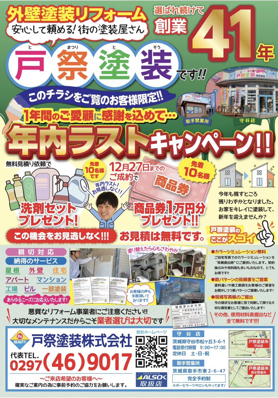 茨城県取手市・守谷市の塗装会社 戸祭塗装では、“塗装のプロ集団”として茨城県、千葉県を中心に、住宅の外壁塗装・屋根塗装、工場・倉庫・店舗の塗装・外壁塗装・屋根塗装を行っております。
